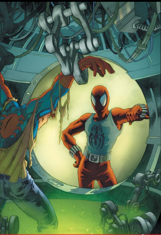 In Clone Saga #2, Ben has simply adopted the Scarlet Spider name and costume. His hair is blonde, he works at the Daily Grind, and he and Peter simply refer to each other as cousins. Ben fights Kaine, and as Ben gains the upper hand, Kaine flees. We find out MJ is sick with the same illness Aunt May has, and Kaine gets mad at the man in the shadows for not only infecting May, but MJ as well. Ben and Peter find Kaine, and Peter beats on him for what he has done to his wife. Kaine does not fight back, but tells them he will take them to the man responsible, and that making MJ sick was not a part of the plan. Kaine leads Spider-man and Scarlet Spider to his "master," who is responsible for what is happening to May and MJ. This turns out to be Jackal, who has created an army of Peter Parker clones, and he seems to want to control the world. So we are at the Maximum Clonage portion of the Clone Saga, and Traveller, Scrier, Det. Raven, The Grimm Hunter, and Spidercide have been completely omitted. Also worth noting; Kaine is working with the man in the shadows, and seems to be connected to The Jackal as well.