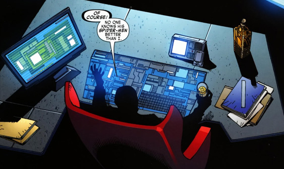 We see a man covered in shadows, watching everything on multiple video screens who replies, "Of course! No one knows his Spider-Men better than I."